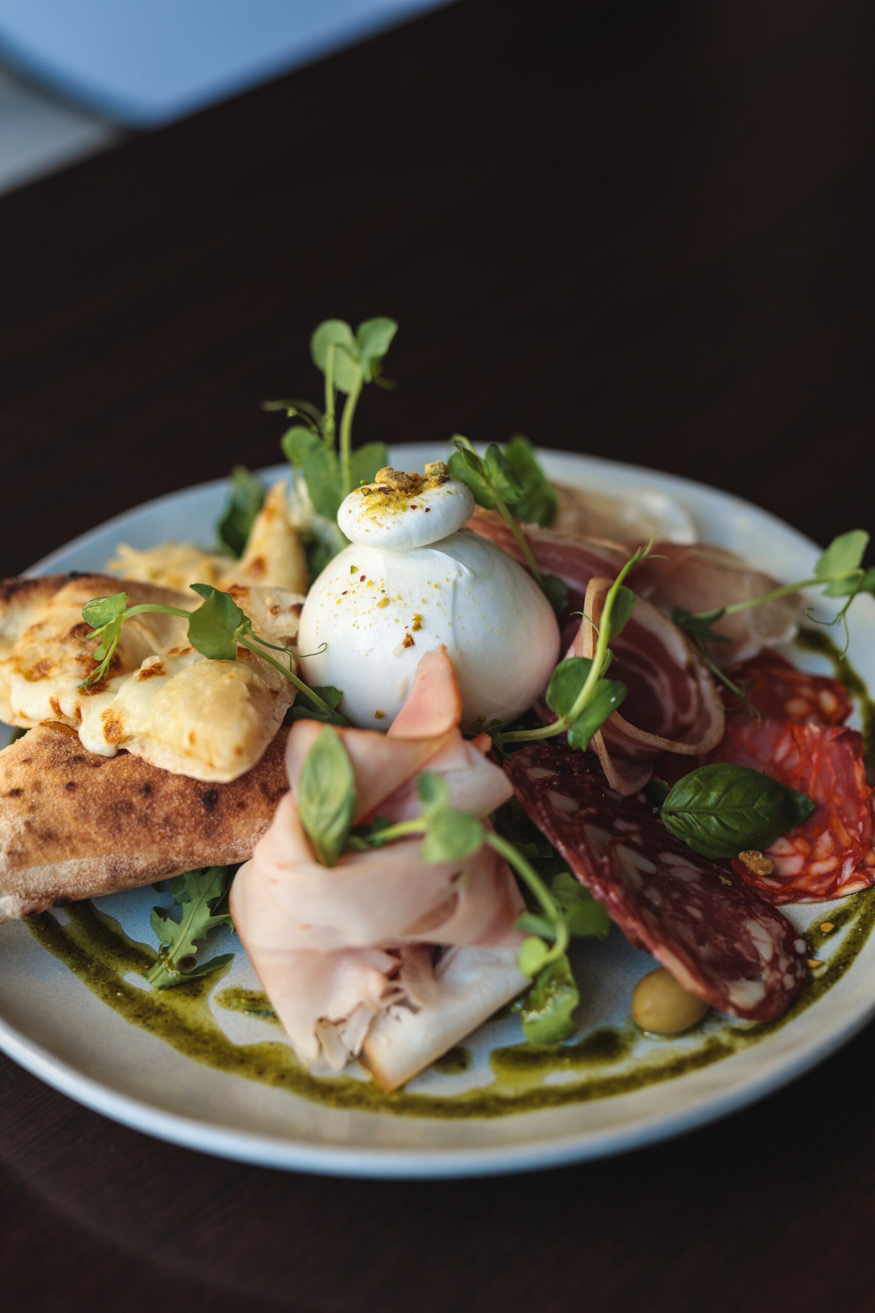 Frischer Rucola, Kirschtomaten, Büffelmozzarella, Räucherkäse, Gorgonzola, Oliven, gekochter Schinken, süße Salami, pikante Salami, Pancetta, Parmaschinken, Pistazien, Pesto, frisches Basilikum, Focaccia