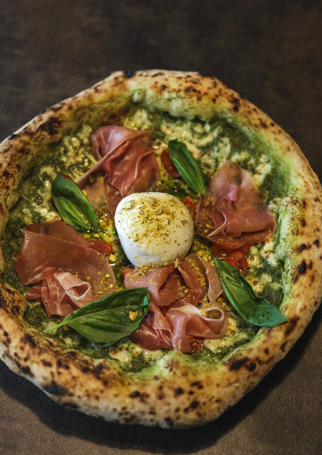 Pistazienpesto-Basis, fior di latte Käse, Kirschtomaten, Parmaschinken, Burrata, frisches Basilikum