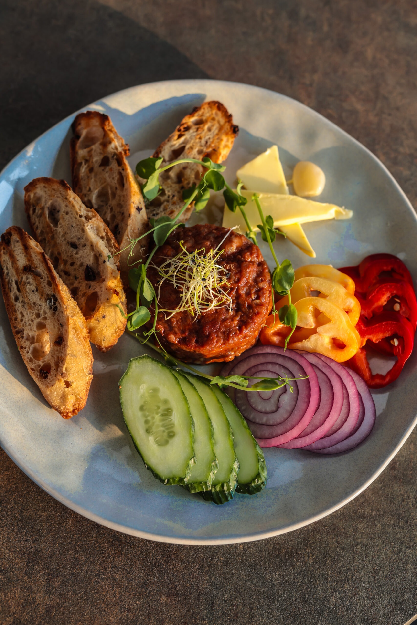 Frischer, zitroniger Rucola, cremige neapolitanische Burrata, Cocktailtomaten, Pistazien-Pesto-Dressing, Erdbeerpüree, Pistazienbrösel, frisches Basilikum, Grissini